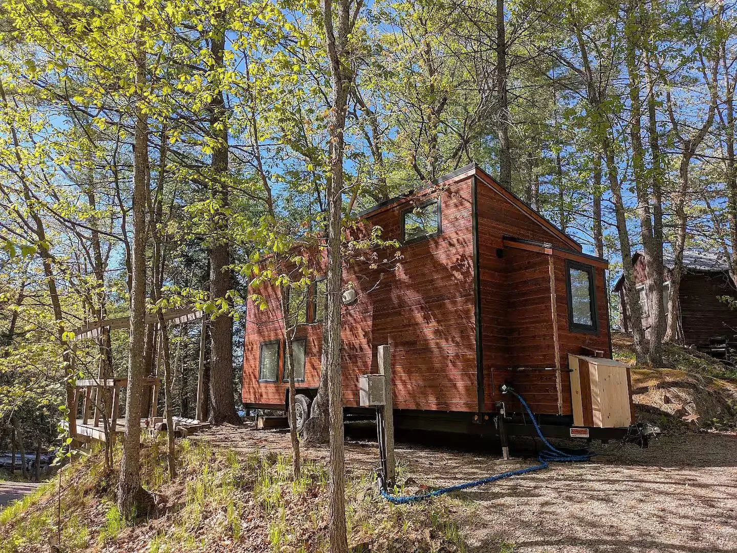Nestled in the woods along the Muskoka lakefront, this custom-built tiny home on wheels offers a luxurious glamping experience just a short drive from Toronto. Designed by Tammy as an evolution of our first tiny house, every inch was crafted to balance nature and comfort β from the skylight above the loft bed for stargazing to the cedar-lined spa-style bathroom.
